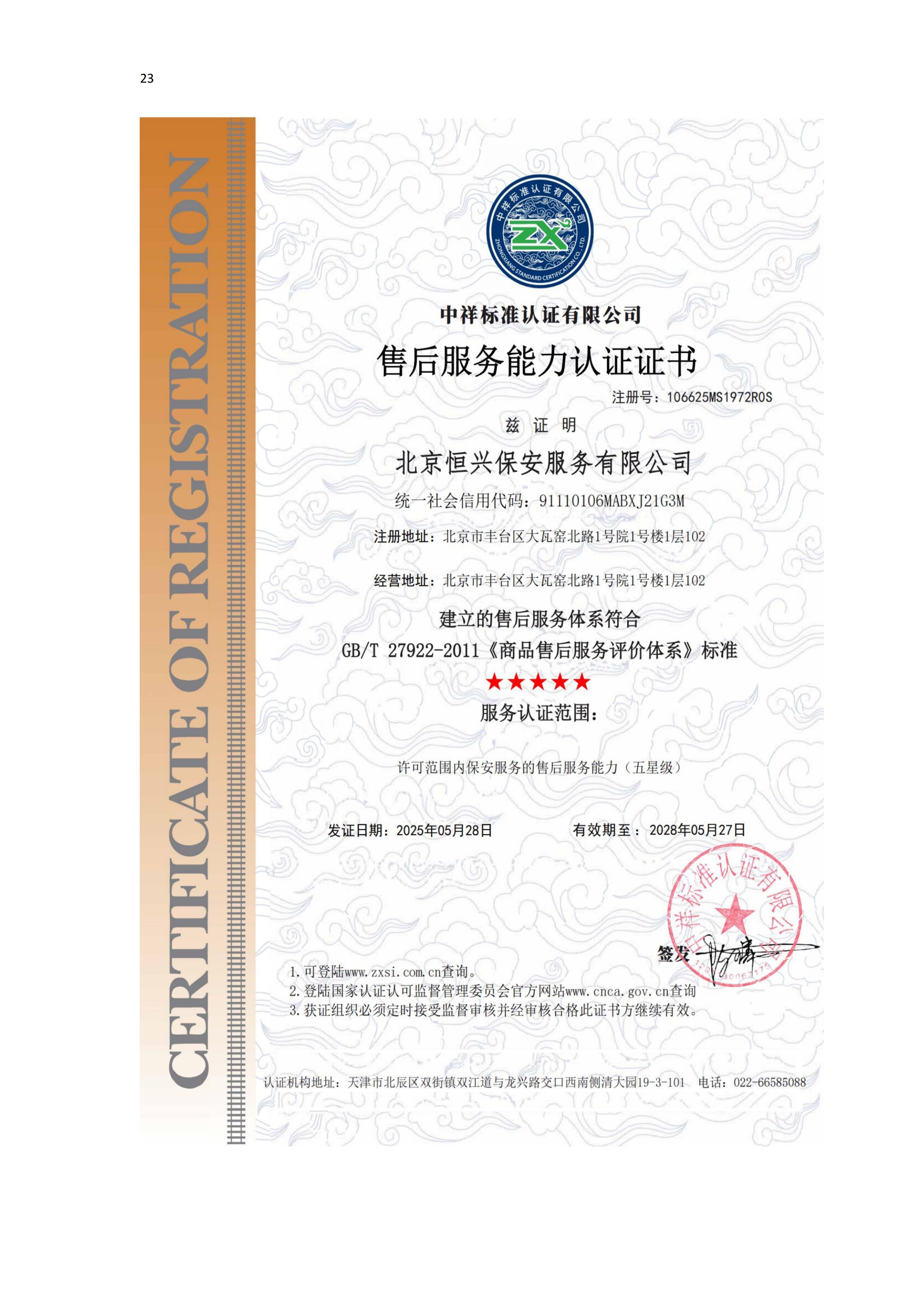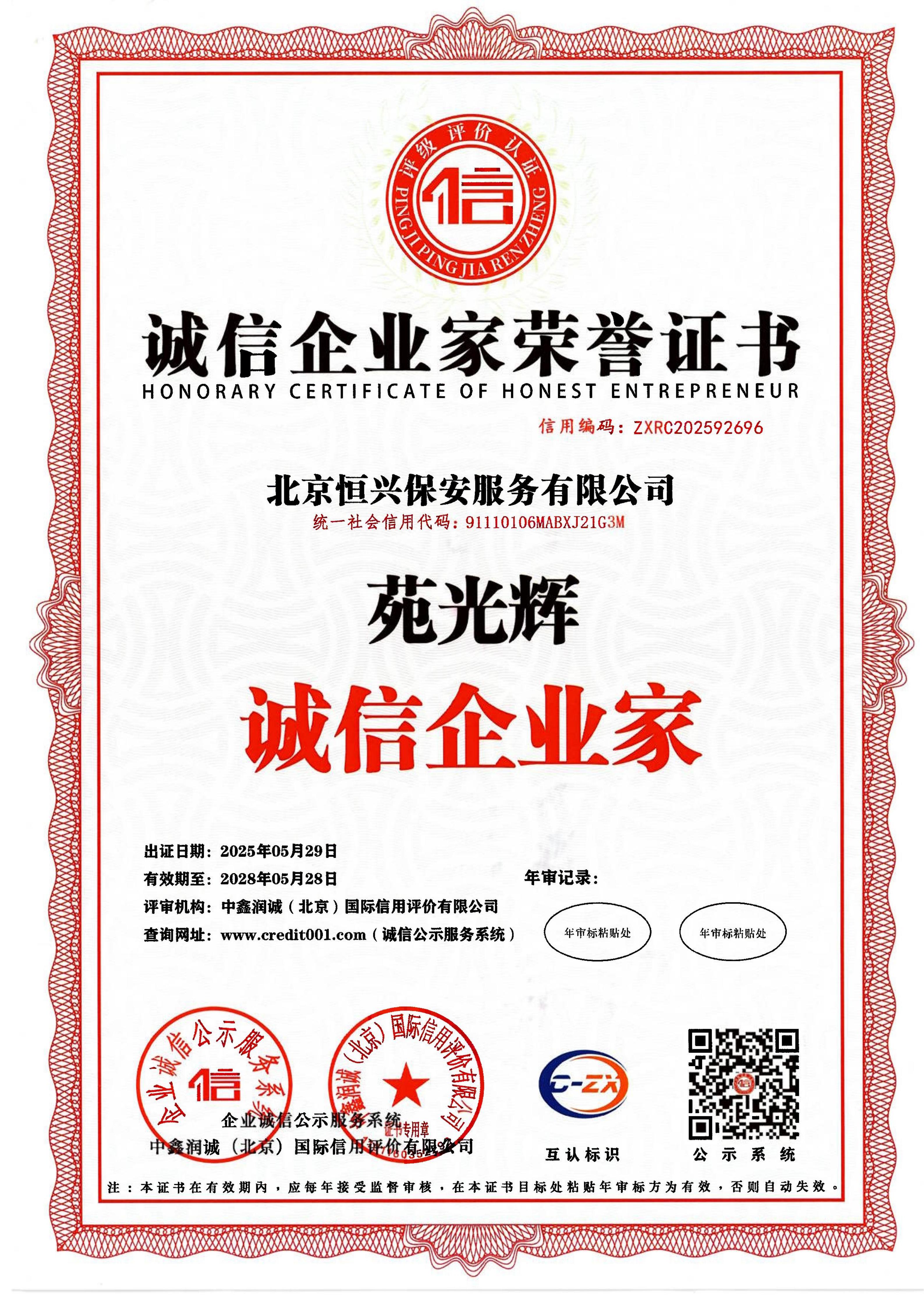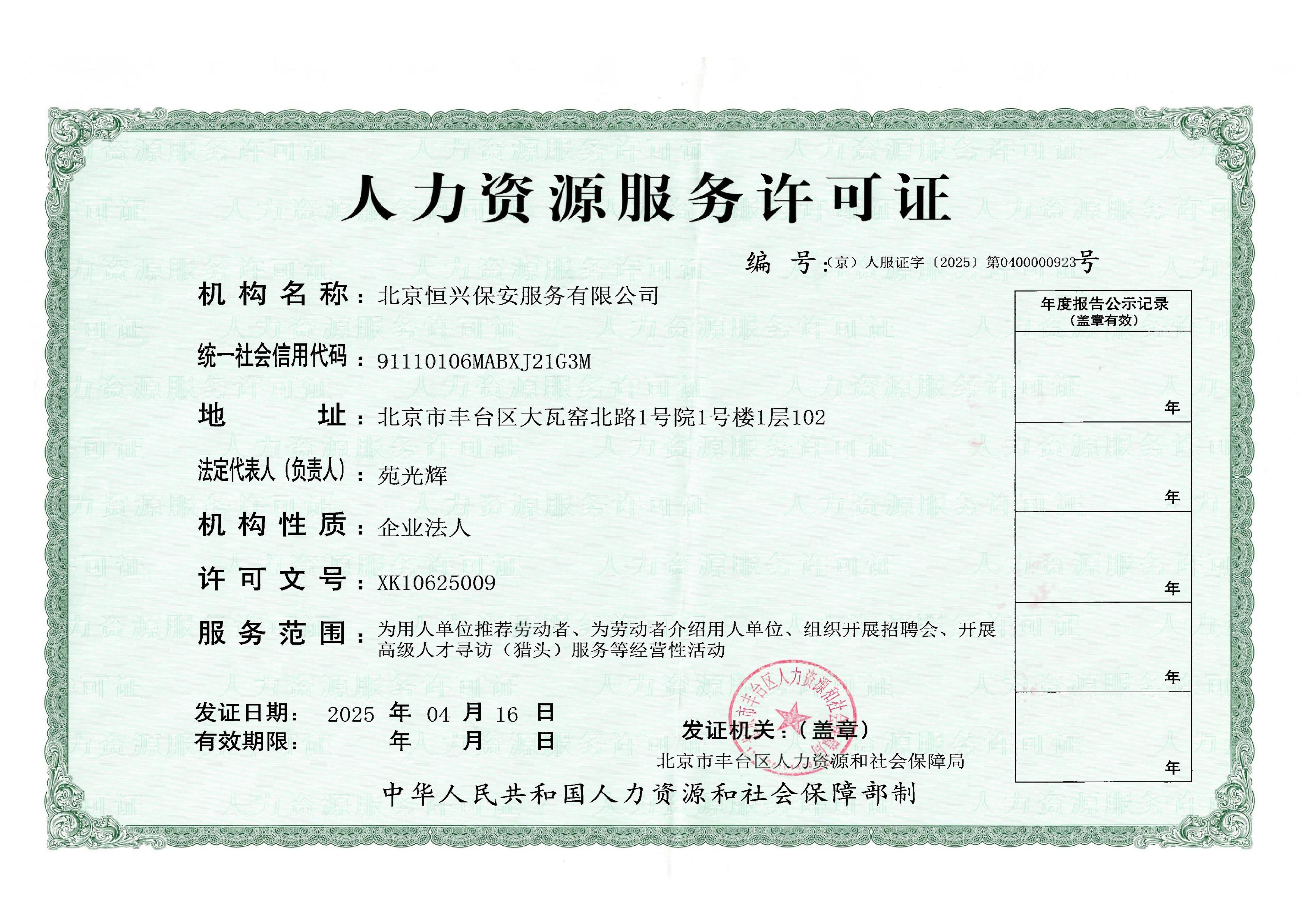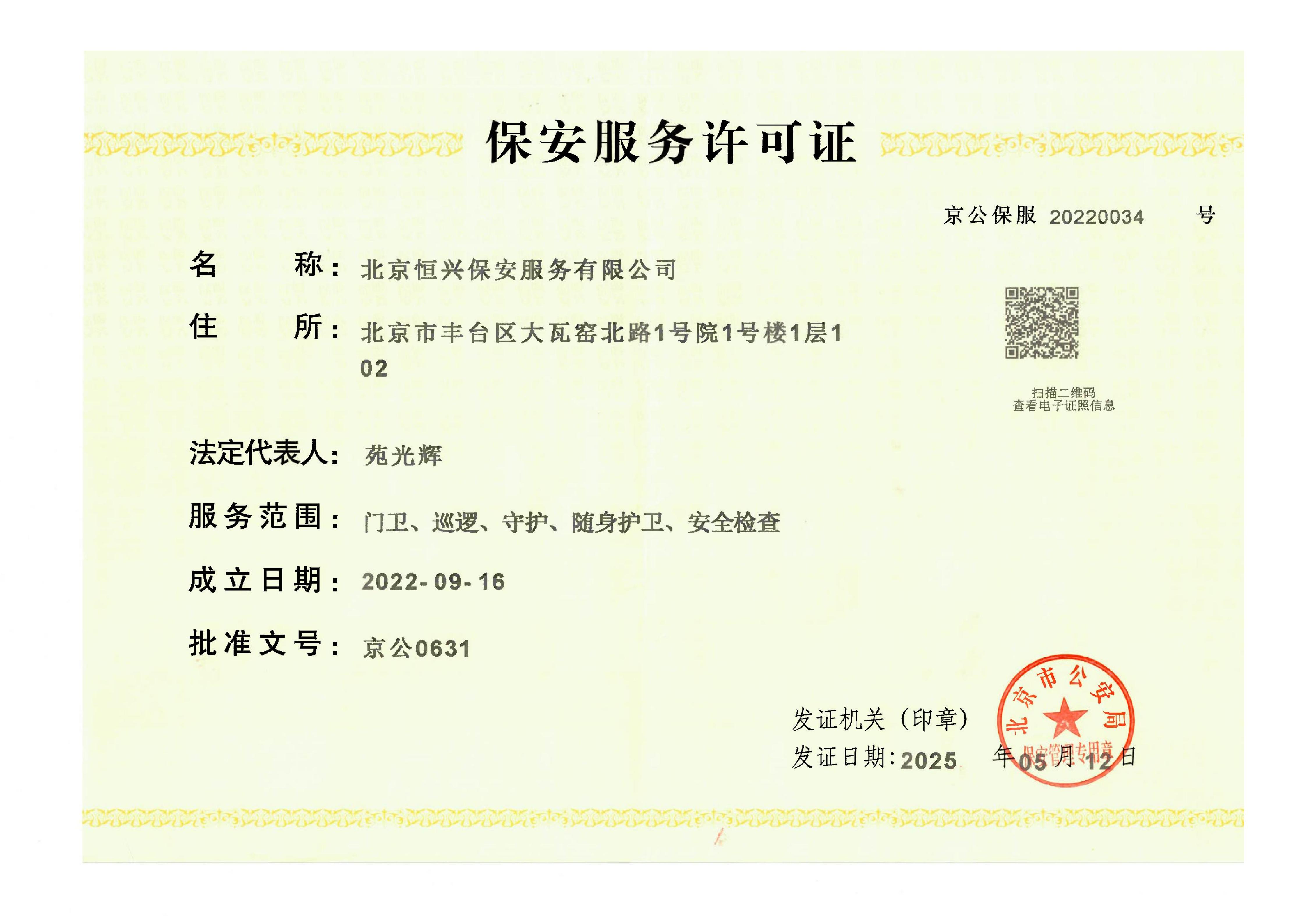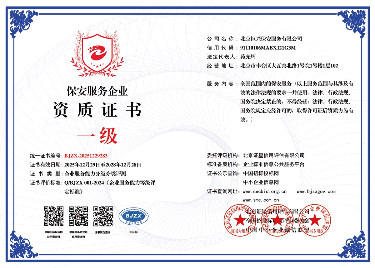 北京恒兴保安服务有限公司成立于 2022 年 9 月 16 日,是经北京市公安局批准设立、持有《保安服务许可证》的专业安保服务企业,为自然人投资控股的有限责任公司,法定代表人苑光辉,注册资本 5100 万元,总部坐落于北京市丰台区大瓦窑北路 1 号院 1 号楼 1 层 102。